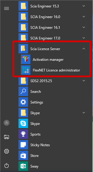 If the SCIA License Server is installed, you will have the next shortcuts in the start menu