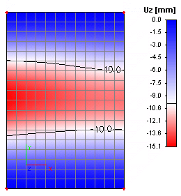 Jestliže ZAPNUTO, uživatel může určit hodnotu (výchozí - nula), která se v grafu označí. Někdy může být nulová hodnota užitečná, aby bylo vidět, kde v konstrukci příslušná veličina přechází ze záporných do kladných hodnot. Někdy může určitá nenulová hodnota rychle odhalit místo, kde příslušná veličina překračuje limit. Příklad na obrázku jasně ukazuje, kde deformace překračuje 10 mm. |