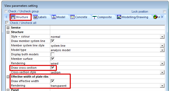 The effective width for internal forces can be graphically displayed on the analysis model, in two different ways.