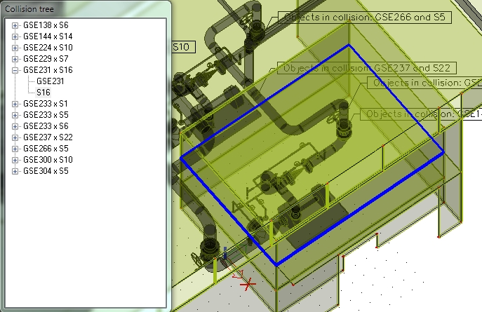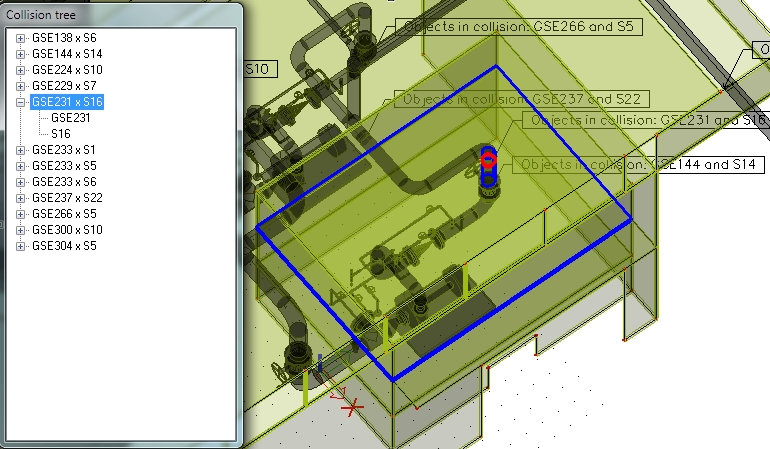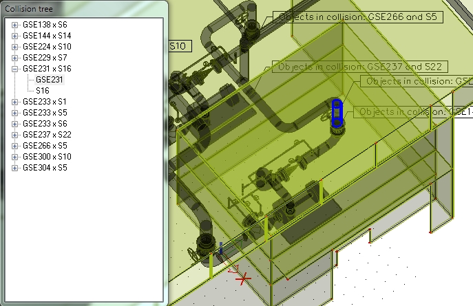 Calculated collisions are displayed as solids with flags and as an item in the collision tree. The item is composed from two parts - the first part is a general solid which is generated by the tool and the second one is the elements which created the collision.