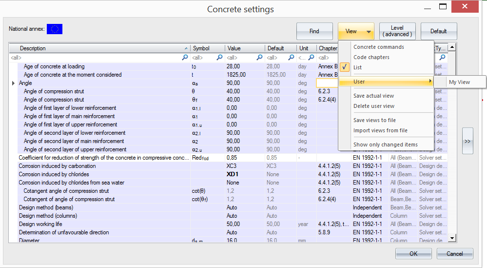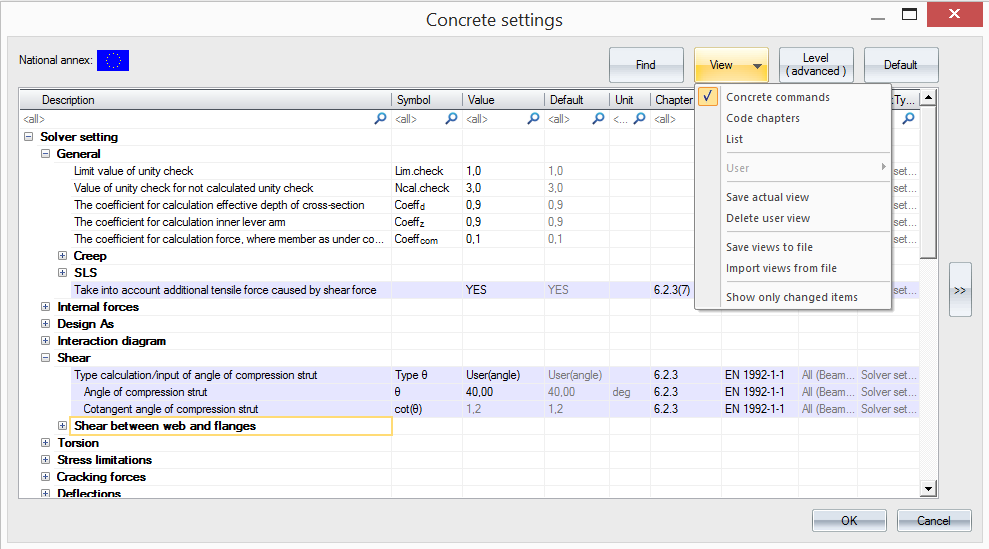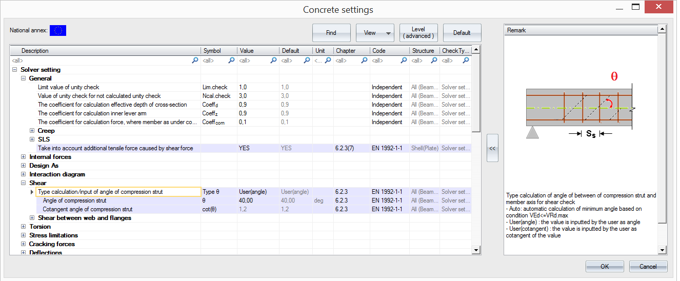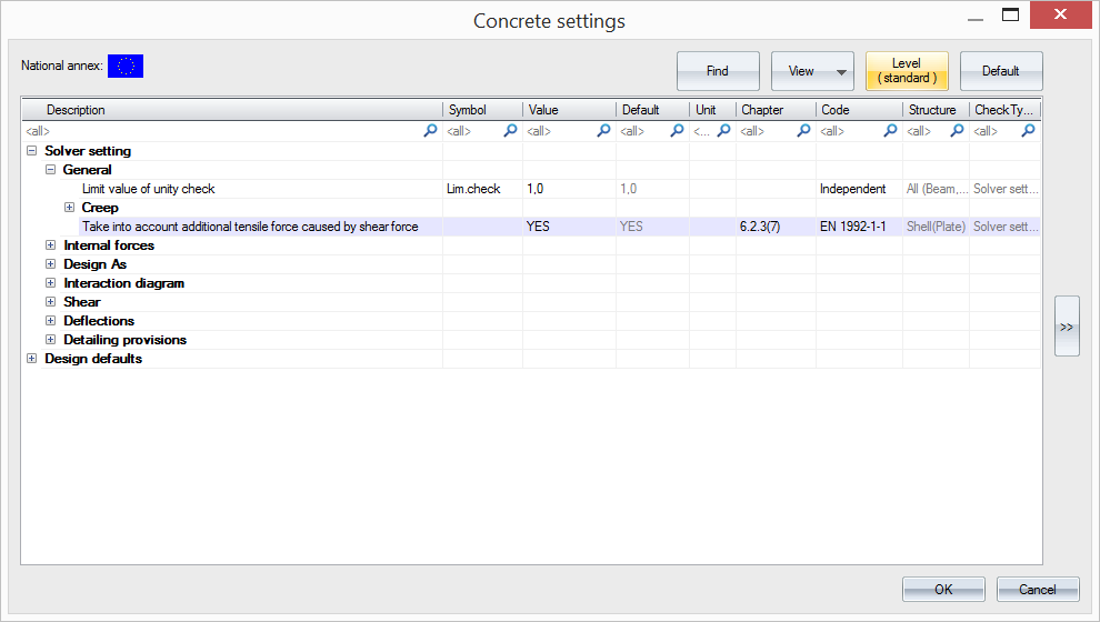 There is brand new Concrete settings (structure) setup for concrete members which contains all needed settings coming from code or calculation routines. The global settings located in Concrete settings (structure) are by default valid for all members in the project, unless they are overwritten by Settings per member - 1D member data. A lot of input parameters and calculation settings are collected here, reflecting the complexity of the Eurocode.