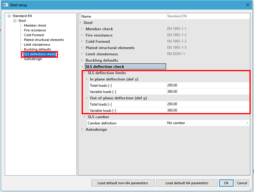 - SLS deflection limit for the total loads: the limit will be applied on the total relative deformation.