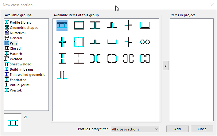 Within SCIA Engineer the different Pair sections are not part of the Profile Library but constructed from base sections (I-sections, U-sections, L-sections etc).
