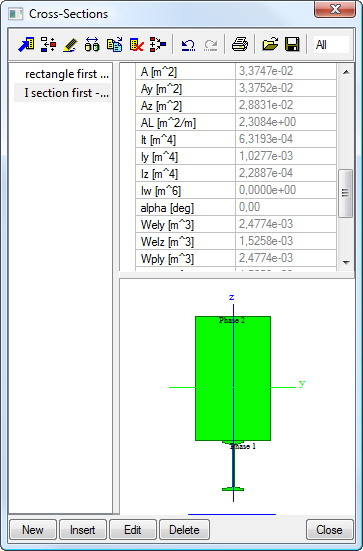 Detailed information on general cross-section module is given in chapter Cross-sections > General cross-section. The important limitation in SCIA Engineer is that only one phased cross-section can be defined for one 1D member! Therefore it is not possible to use the phased cross-section in the arbitrary beam (i.e. the 1D member consisting of several sections made of different cross-sections).