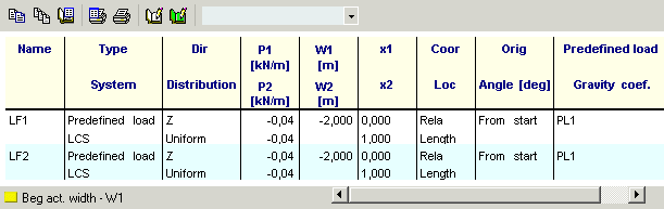 The calculated load intensity is shown in column marked P. The input acting width is given in column marked W.