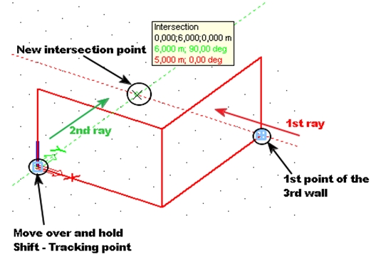 - Create the 4th wall using the tracking ray under angle 30°. Start from the end point of the 3rd wall and use the user-defined tracking point on the starting point of the 1st wall. The intersection point is created by ray under 30° and the ray from the new tracking point on the left corner. See the picture.