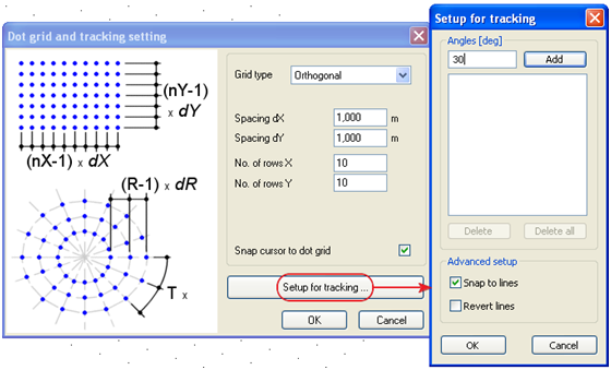 - We need to set one angle of rays. Open dialogue “Dot grid and tracking settings” and use button – “Setup for tracking …”. We use the tracking ray with this angle for inserting inclined wall on the second floor.