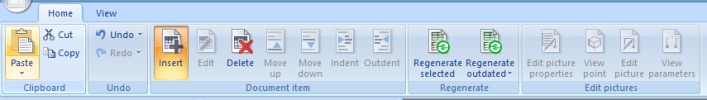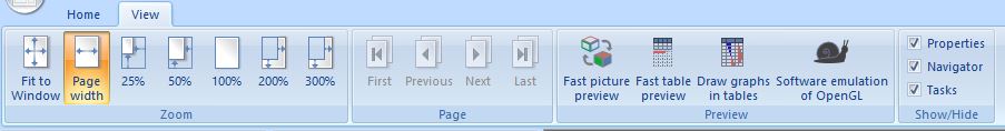 GUI of the Engineering Report consists of a set of main components. Some of them are fixed (ribbon, status bar), others can be moved, closed, resized, docked, ... .