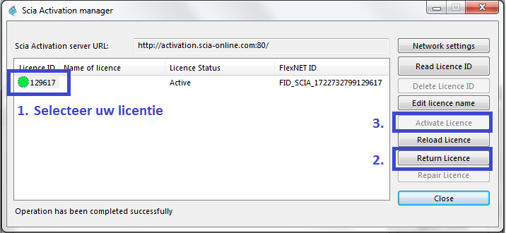 - Then hit (the circle before the Licence ID number will become green).