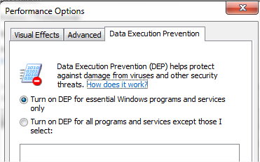 Using option 2 (Turn on DEP for all…) is possible, but with exceptions for:
