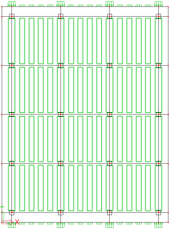 Definition of the prestressing in the postensioned 2D member is done using standard tool Post-tensioned internal tendon. A fictive 1D member has to be defined in the position of the tendons. It means one rib in the column line and one rib for each tendon in the span. The definition is time consuming because you have to define slabs + ribs + tendons. The final screen of that structure is following