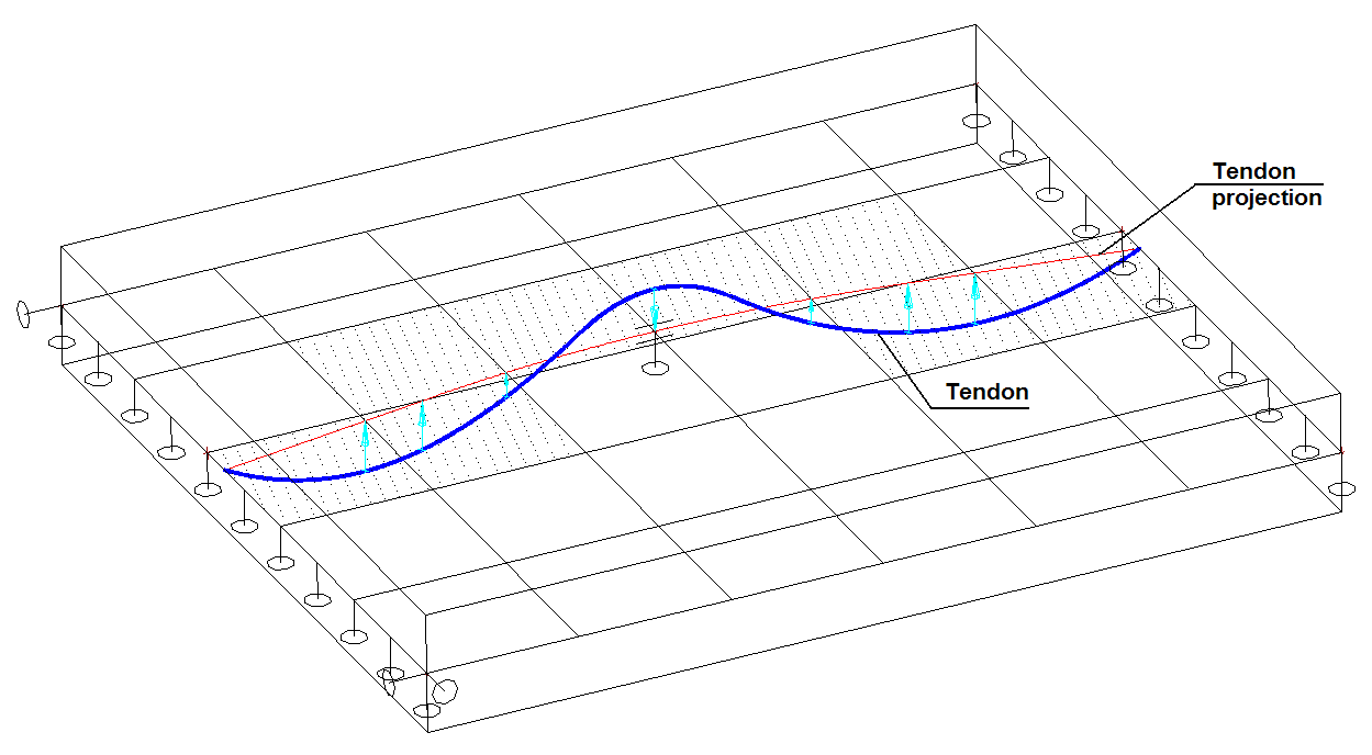 This functionality enables the user to attach internal post-tensioned tendons directly to 2D slab and shell elements. No dummy beam 1D (rib) is necessary. The mesh of the internal post-tensioned tendon and attached 2D elements can be independent.