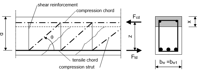 General concept of "strut-and-tie" model is used for the prediction of shear effects in concrete. In this model, the top compression and bottom tensile members represent the compressive concrete and tensile reinforcement, respectively. The horizontal members are connected by the compressive virtual struts and reinforcement tensile ties. The axial forces in tensile ties should be transmitted by the shear reinforcement.