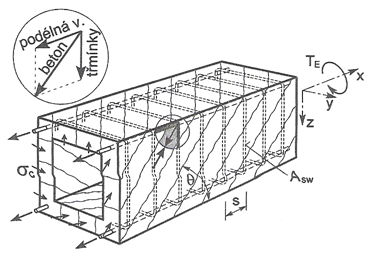 The torsion check is commonly based on the theory of the concrete truss-model too. In this theory a virtual truss-model is imagined in a concrete beam. This truss-model has a set of vertical (or slightly diagonal), horizontal and diagonal members. The vertical bars are considered to be the stirrups; the horizontal bars are the main reinforcement and the diagonal bars are the concrete struts.