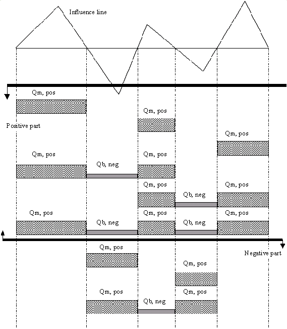 Each line below the influence line shows the possible division of the load system. E.g. the first line represents the distributed load Qm,pos positioned only on the first positive part. The third line is the represents the distributed load Qm,pos divided between the first and second positive part and the unloading of the distributed load Qb,neg that causes an important reduction of the overall effect in the summation of loaded parts. It can be seen from the picture that the maximal effect is reached if the load is positioned only on positive or only on negative parts of the influence line. Each of them results in an extreme. The critical position is therefore determined separately for the positive and negative part.