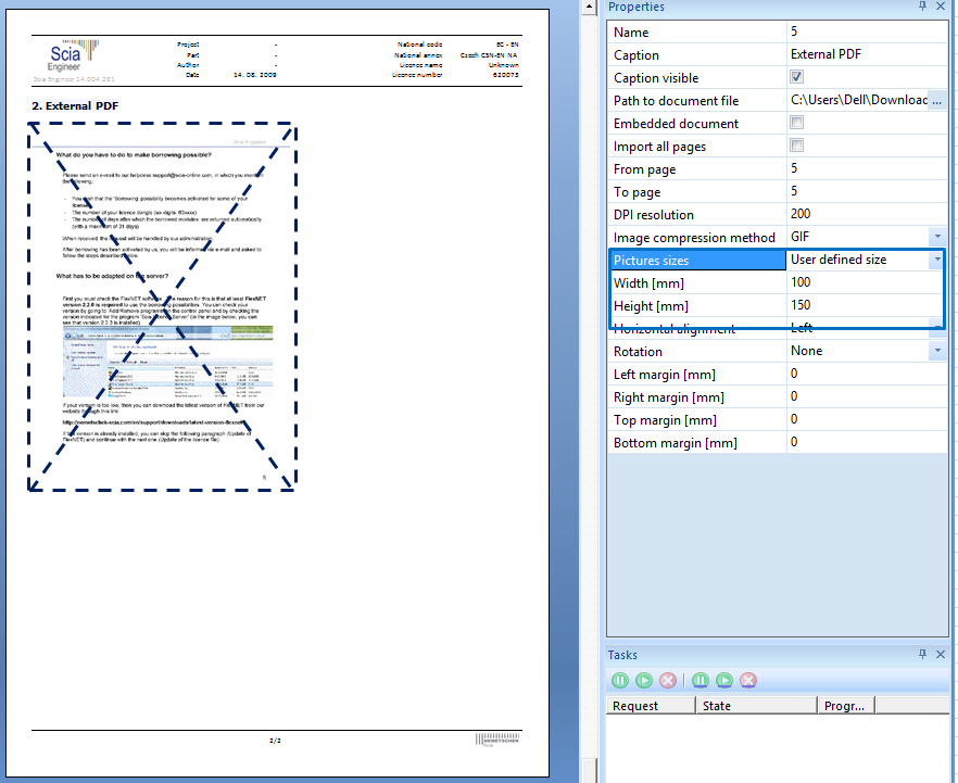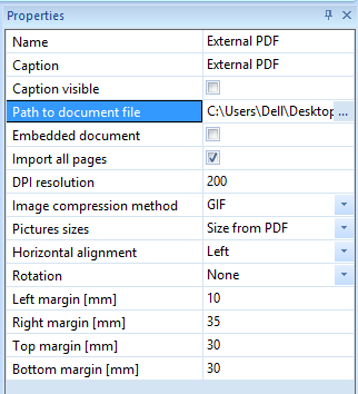 Link to file on the hard drive: When the External PDFs are inserted as a link their validity status informs about changes in the source file on the hard drive. They are marked as invalid when the source file changes. Then during regeneration their content is updated and redrawn. Those External PDFs are not displayed when the project is opened on different computer and the report item is regenerated.