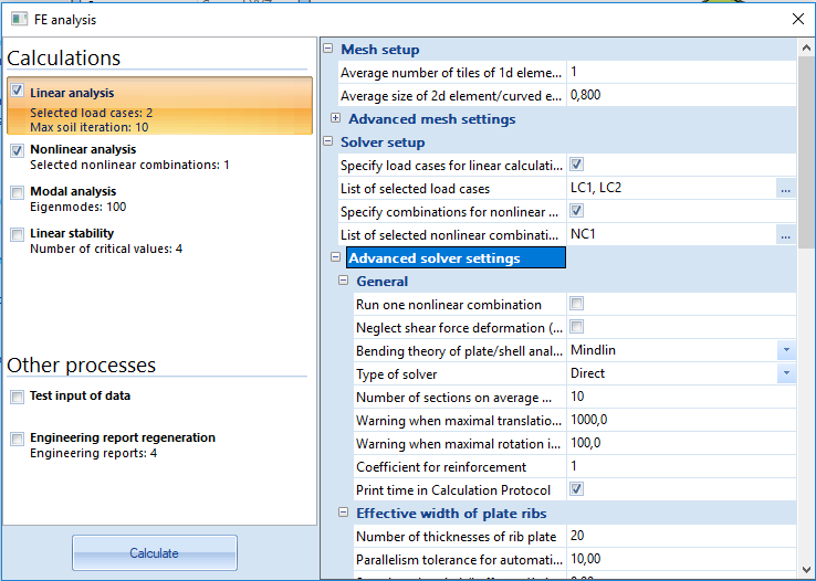 Calculation dialog itself is divided into two main parts. In the left part there is a list of available calculations and other processes with some info about every calculations like number of load cases, number of seismic load cases, number of soilin iterations, number of eigenmodes or number of critical values for stability analysis.