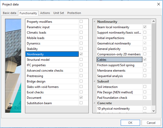 Note: Proper settings must be made in Project Setup dialogue, Functionality tab. Options Initial stress, Nonlinearity, Beam local nonlinearity and "Geometrical nonlinearity" must be selected.