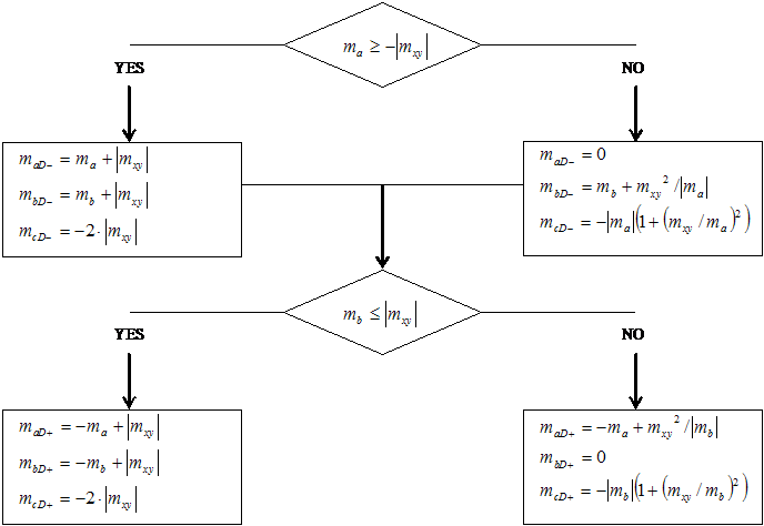 The values of the design moments and forces according to „classical“ algorithm are calculated according to the left branches of the flow diagrams stated above, i.e. without respect to the relation between mx, my and mxy (or nx, ny a nxy). This calculation is on the safe side, but in some cases it could be less optimal.