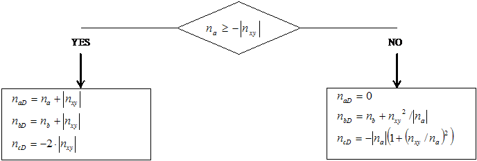 The right branch is used if some of the directions of the reinforcement calculated according to the left branch is pressed (negative value of the correspondent design magnitude). In this case a zero value of the design magnitude is assigned to this direction, and the other direction will have lower value of design magnitude (and consequently lower necessary reinforcement area) than by calculation according to the left branch (the condition of the capacity is granted in both cases). The calculation according to the right branch causes higher pressure in the concrete (magnitudes mcD and ncD) than according to the left banch. By this point of view the EC2 algorithm could be considered as more cost-effective.