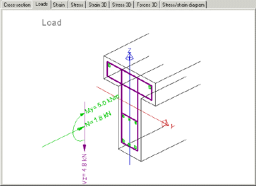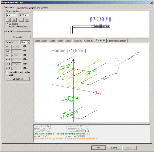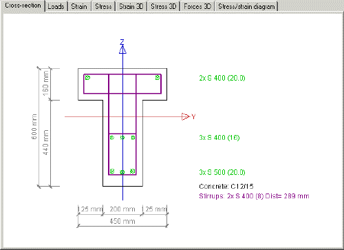 Shows the cross-section, its dimensions and defined reinforcement. |