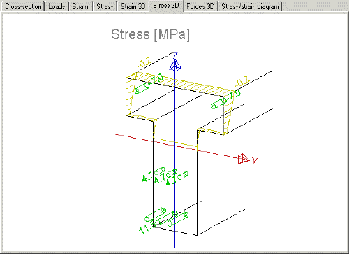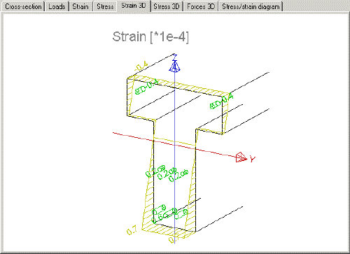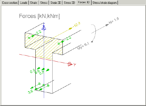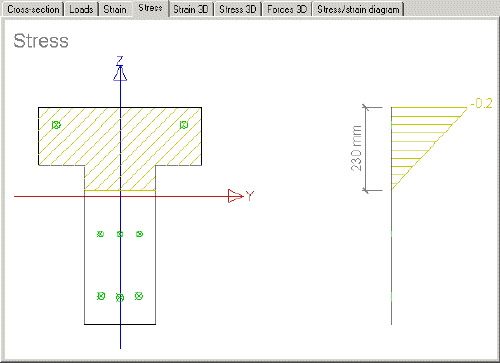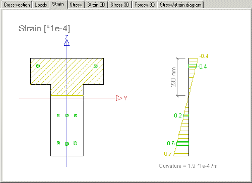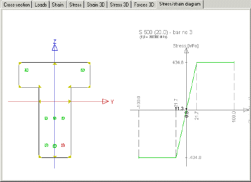 Shows the stress-strain diagram for the selected section. The user may click a point in the section (in the left hand side part of the graphical window) and see the corresponding position on the diagram (in the right hand side part of the graphical window). |