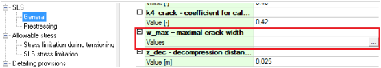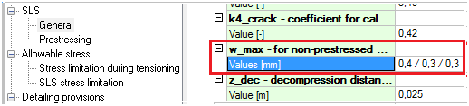 The maximum crack width is possible to set for prestressed concrete in National annexes now. New values appear only in case when Prestressing is ON in project data. Otherwise old three values related to non-prestressed concrete are there.