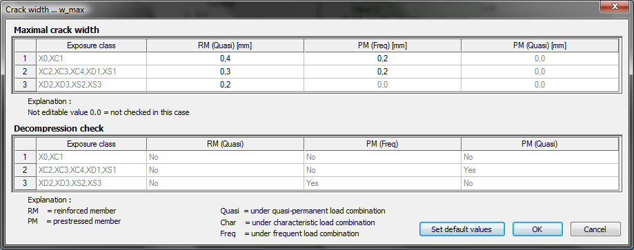 Using three dots button you get access to the table of limit crack width (see chapter 3) and also table with information about check of decompression (the second table).