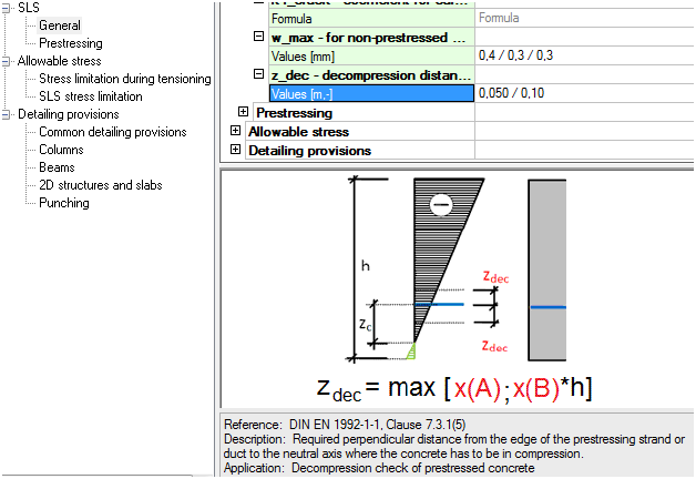 This manual describes the implementation of the check of decompression according to chapter 7.3.1(5) EN 1992-1-1 in SCIA Engineer. Together with check of decompression the limited values of crack width for prestressed were implemented. Check of decompression is done only for prestressed concrete 1D member. The check of decompression means the prestressing strand or tendon lie in the predefined zone of the concrete which is in compression. The decompression distance (zdec) where the concrete is verified is set in the EN 1992-1-1 and default value is 25 mm. This value is measured from the edge of the strand (pre-tensioning) or edge of the duct (post-tensioning).