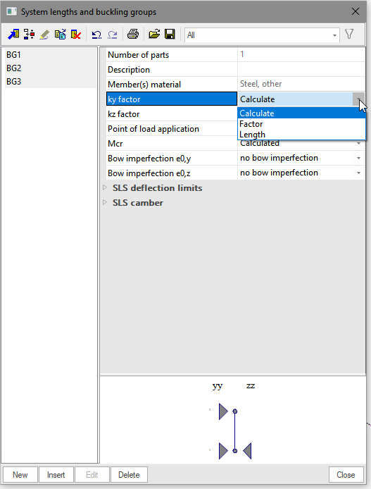 System lengths and buckling groups is in fact a library dialog in which all the defined buckling groups (BG's) are gathered. It gives the user an overview of all the buckling groups and allows editing of the buckling settings defined in the buckling groups.
