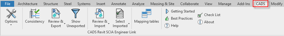Once the link is implemented into Revit, the ribbon CADS in Revit is displayed. There are buttons and dialogues which are used in the link between Revit Structure and SCIA Engineer or to export project to R2S file.