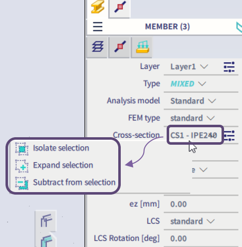 Right-clicking on a property allows to modify the current selection. The user can isolate the entities with only this property from the entire selection, or expand the current selection and add all entities with this property, or subtract all entities with this property from the entire selection. It is easy to combine multiple properties at once, e.g. select all elements with a certain cross-section and length by selecting a member, using "Expand selection" on the cross-section and using "Isolate selection" on the desired length.