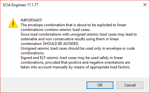 There are still, however, some possibilities that can end up having an unsigned seismic load case in a linear combination without triggering the message above, in particular when the project has been created in an older version of SCIA Engineer. Therefore, please be careful not to use unsigned seismic load cases in linear combinations.
