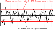 As a matter of fact, the modal superposition methods applied in the response spectrum method (e.g. SRSS or CQC) are statistic methods that aim to estimate the envelope of the seismic response (red lines in the chart below) of any variable of the structural behaviour, without explicitly computing the time history response of the structure (black curve).