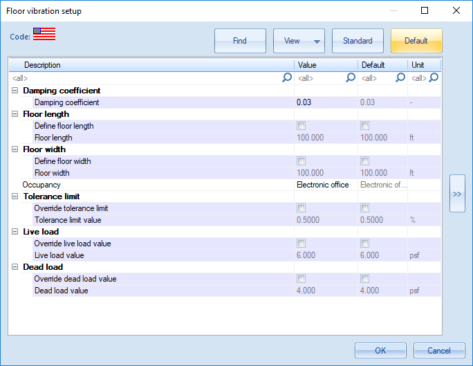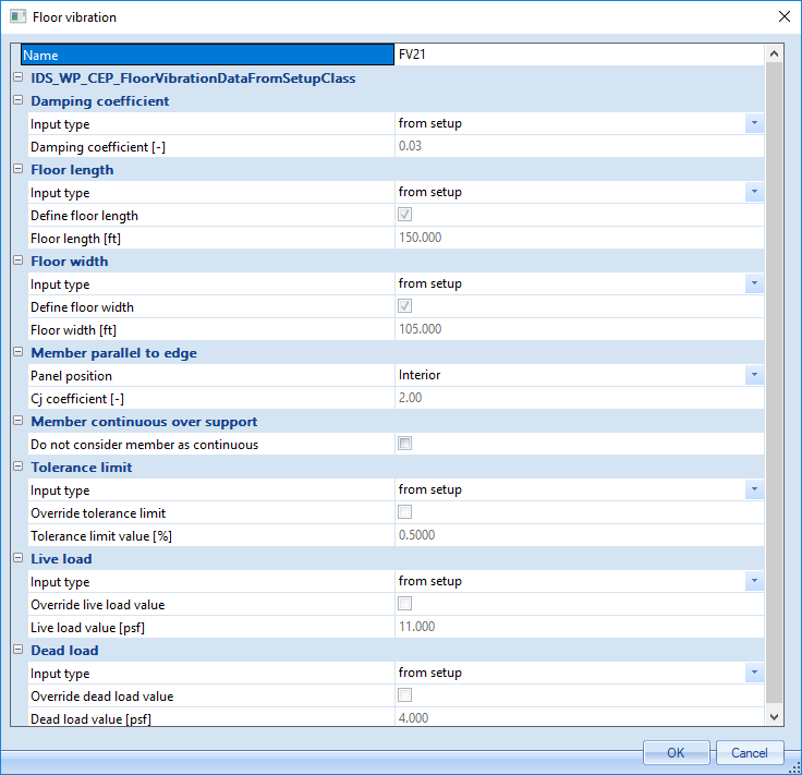 Settings related to how the floor vibration check is implemented in the project can be input in two ways: as floor vibration setup data or as floor vibration beam data. Floor vibration setup inputs are applied to the entire project while floor vibration beam data inputs are applied only to the members to which beam (or member) data is applied. For inputs which are available in both the floor vibration setup and in the floor vibration beam data, the input in the beam data will override the input in the setup.
