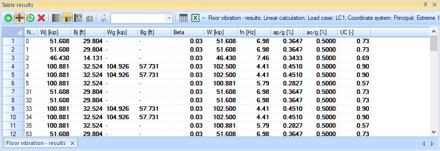 Once any desired settings have been made in the setup and/or member data, the results of the check can be displayed by selecting Floor Vibration Check and then selecting Refresh in the properties window. A result value and selection can be set as needed. Note that the selection option only determines for which members the results are shown. By the nature of this check, all members in the project must be processed in the calculation. Additionally, it should be noted that no load case or combination is needed for the floor vibration check. Dead and live loads are simply defined in the setup or member data. The live load is based on the occupancy type by default and a dead load value of 4 psf is used by default.