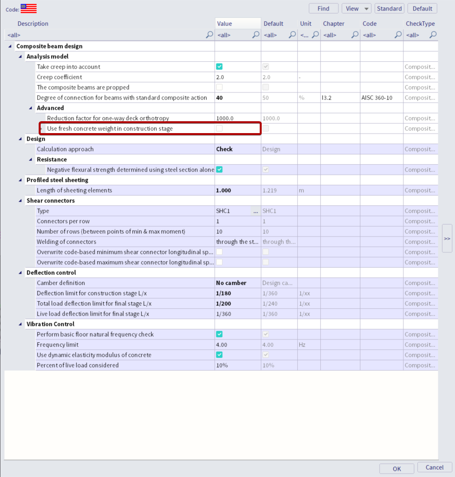 Composite beam checks and design involve analysis of the members for both construction and final stages and for multiple limit stages (strength and serviceability). For this reason, some consideration is required to properly set up load cases and combinations, as well as a load class. The load class is required so that all stages and limit states can be considered and checked simultaneously.