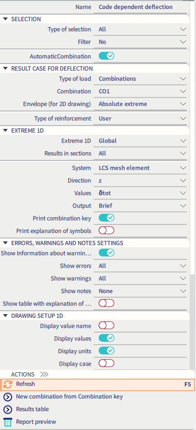 There is possible to evaluate deflection for 1D and 2D in one command and properties in these command are filtered according to, if in the project are only 1D members, only 2D members or both