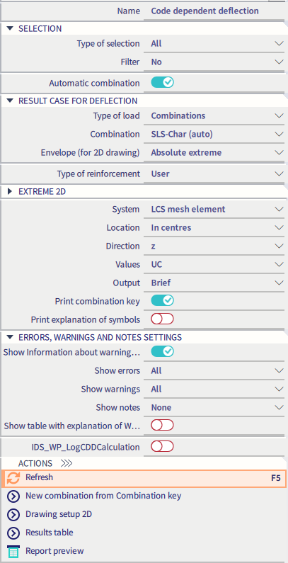 Load case/combination or class can be defined in the group, which will be used for calculation code dependent deflection. For automatic generation of combinations from defined results case a special combination for calculation immediate deflection and deflection caused by creep, will be created on the background. There are supported following result cases: