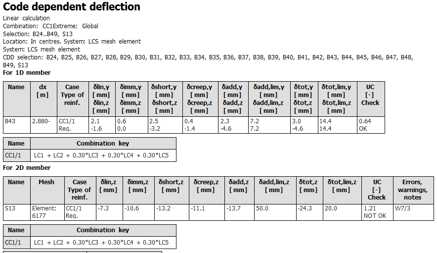 | N7/1 | Note | NThe nonlinear stiffnesses are calculated for some members only ( see selection of members in CDD), the deflections can be different for another member selection in CDD. | To use all 1D and 2D members for CDD calculation |