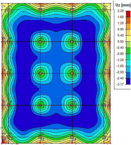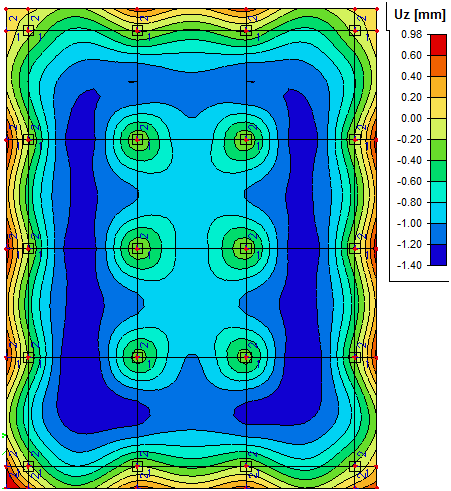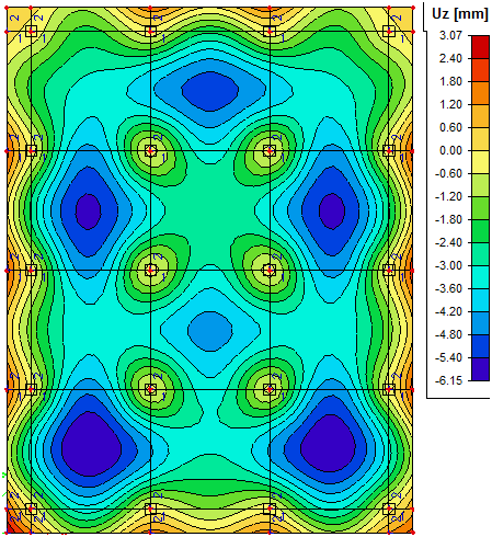 With respect to different modelling of the post-tensioned slab (see "4.1 Three possibilities of prestressing input") the evaluation of CDD deflections is available only for one of them. Code dependent calculation with the real post-tensioned tendons modelled by hanging nodes or allocated in the ribs is not possible in version SCIA Engineer 2011. The code dependent deflections are available only for the prestressing defined by the equivalent load. The background of the CDD calculation is more explained in "2D Concrete design - EC2; SCIA CZ, s.r.o, Prague 2011".