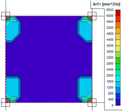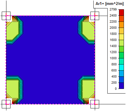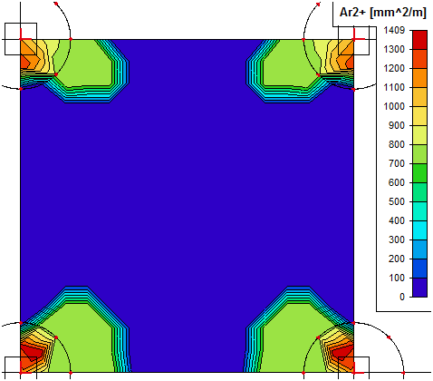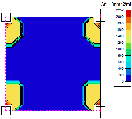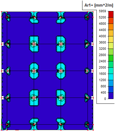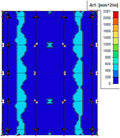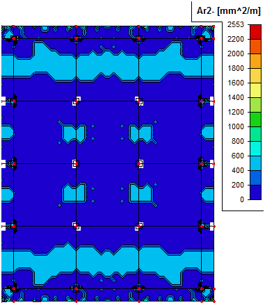 The biggest required areas are for the upper reinforcement above columns. These regions are problematic during our design for several reasons