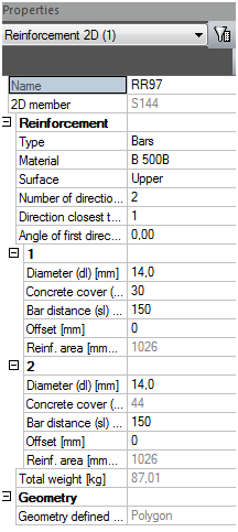Finally the additional reinforcement will be added as calculated in the previous chapter. We can add bars or mesh reinforcement. The settings of the reinforcement for both surfaces are the following: