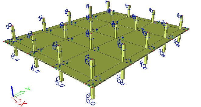 The model of the 4th floor is supported on both ends of the columns. The lower side is fully rigid and the upper side is rigid except in the Z direction where it is free.