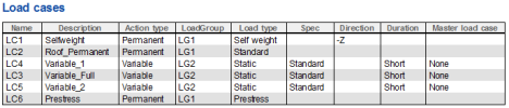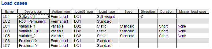 The following loadcases have been defined in the example. The permanent loadcases LC1; LC2 and LC8 can be assigned to the same load group (LG1). Variable loadcases are stored in LG2 which has an exclusive relation and is in category F. Two permanent loadcases Prestress X and Prestress Y are needed for the model using equivalent load (explained in detail in "4.1.1 Definition of the equivalent load")