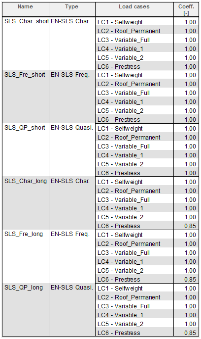 Several combinations are defined in this example. One group is for the ultimate limit state (ULS_short, ULS_long) and the second group is for the serviceability limit state (characteristic, frequent, quasi-permanent). On the following figure you can see only the content of the combination. The load factors are automatically taken into account for each combination in the background. Combinations are defined with respect to the type of modelling of prestressing (real tendon, equivalent load). For more information about both types see chapter "4 Prestressing of 2D members in SCIA Engineer".