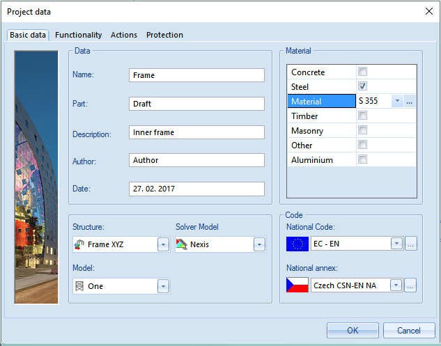 below National Code to choose the default code for the project. This code will determine the available materials, combination rules and code checks. For the project of this Tutorial, choose EC-EN. - Select a National annex. For this example choose Czech CSN – EN NA.