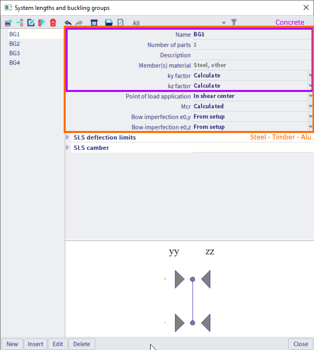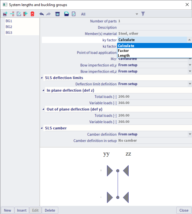 System lengths and buckling groups is in fact a library dialog in which all the defined buckling groups (BG's) are gathered. It gives the user an overview of all the buckling groups and allows editing of the buckling settings defined in the buckling groups.