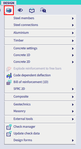 The Design menu offers all features for the design and check of steel members and connections, aluminium members, timber members, concrete 1D and 2D elements, composite elements,...