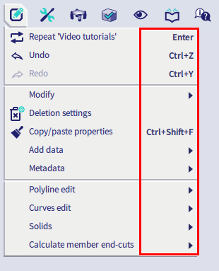 This menu contains all action-related functions and is closely related to the Input panel (that contains all input-related functions). Commands that are not accessible via the main menu can be found via the SCIA Spotlight.
